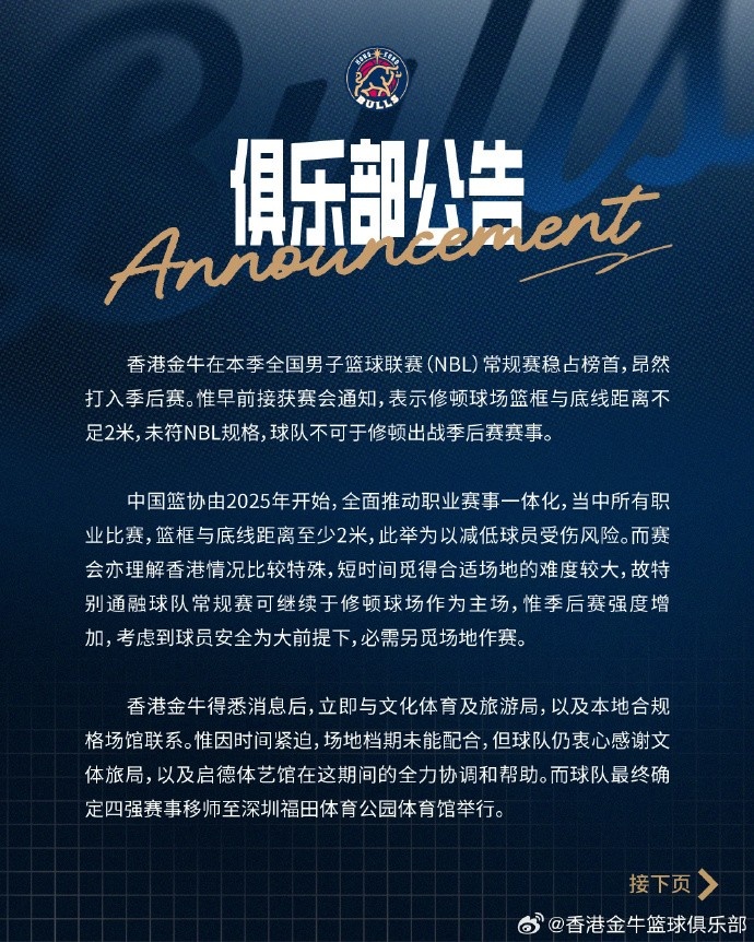 香港金牛在本季全国男子篮球联赛(NBL) 常规赛稳占榜首,昂然打入季后赛。惟早前接获赛会通知,表示修顿球场篮框与底线距离不足2米,未符NBL规格,球队不可于修顿出战季后赛赛事。