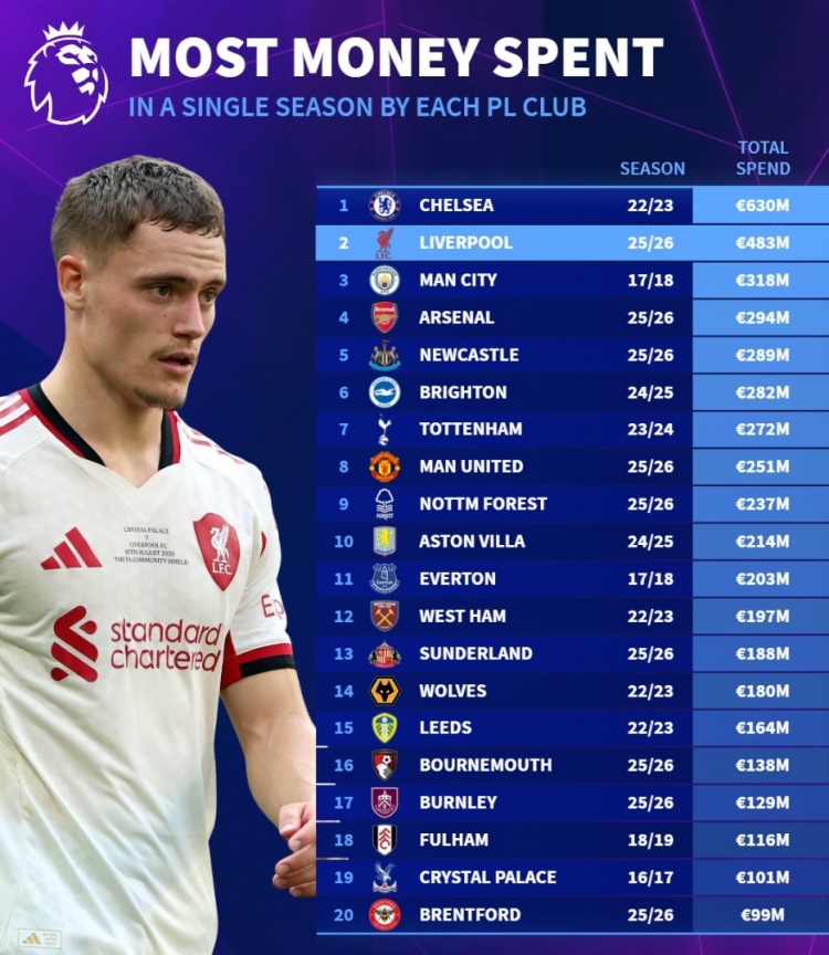 9月4日讯 《转会市场》统计了英超各队的单赛季转会费支出纪录情况,切尔西22-23赛季豪掷6.30亿欧元仍最高。